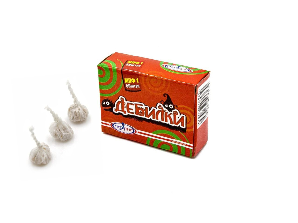 При броске петарды на землю камушки сталкиваются с солью и получается небольшой хлопок. Если бросить несколько штук сразу - эффект усиливается. Название "Дебилки" было придумано из-за необычного и при этом крайне простого применения петард.