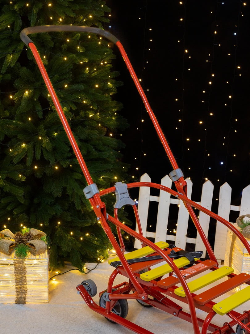 Модель предусматривает высокую ручку для того, кто толкает санки.