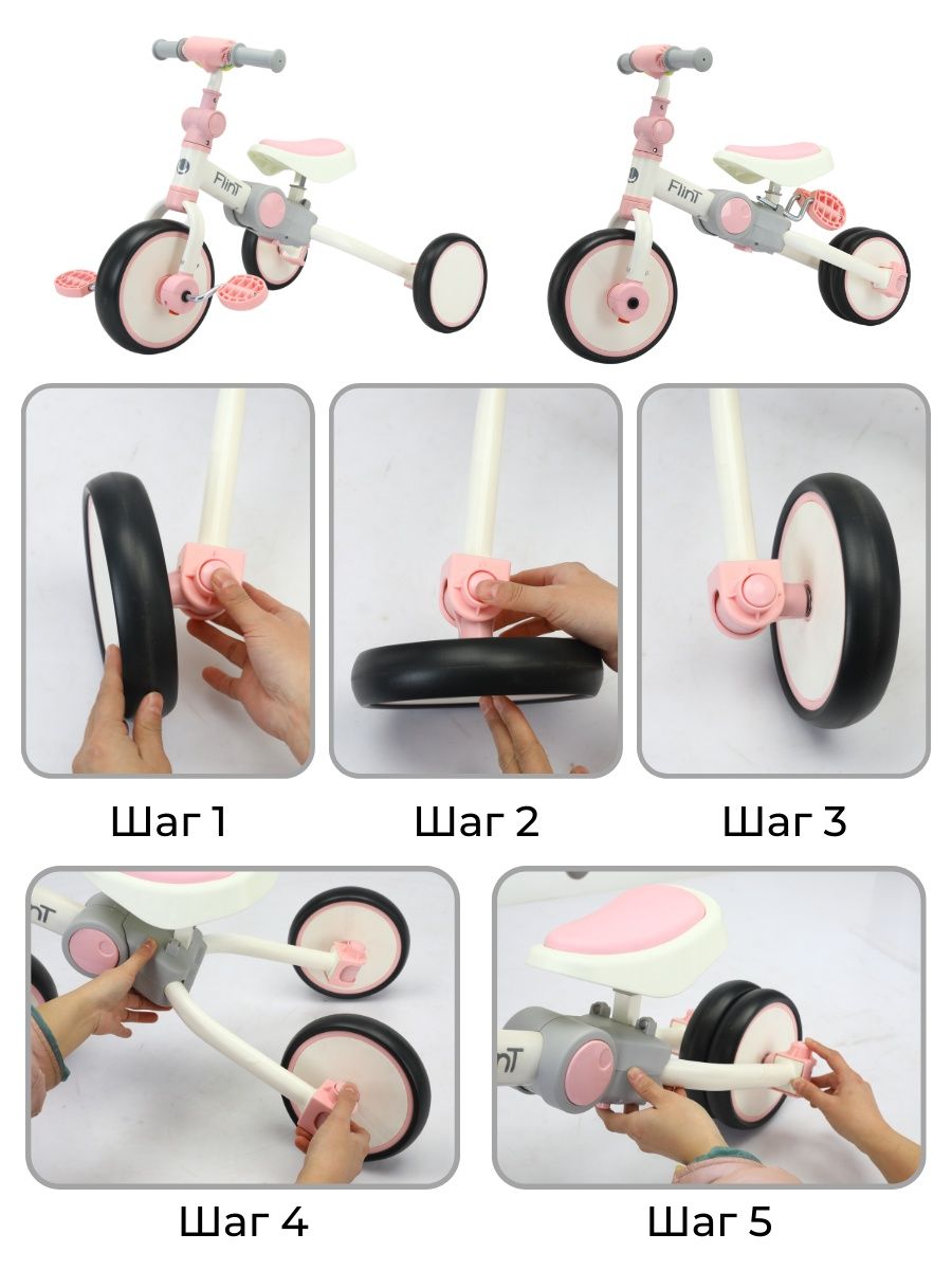 • Трансформер 4 в 1: двухколесный, трехколесный беговел и двухколесный или трёхколесный велосипед;