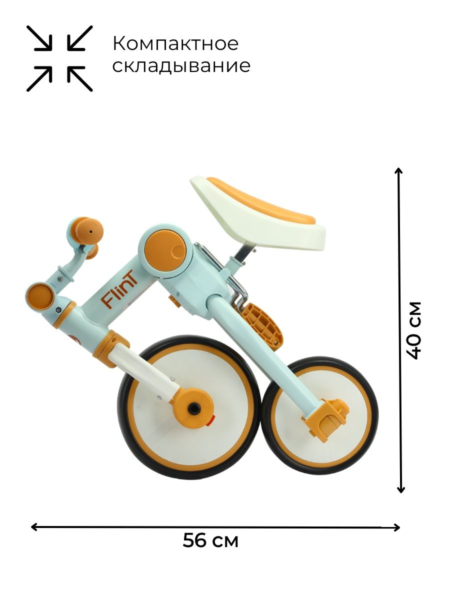 Для безопасности малыша предусмотрен режим холостого хода у педалей, поворот переднего колеса ограничен 20 градусами и прорезиненные ручки на руле для надежного хвата руля. Телескопическая родительская съемная ручка, которая подойдет под любой рост. Сиденье регулируется по высоте и подходит как для мальчиков, так и для девочек. Простой механизм трансформации и небольшие габариты в сложенном виде позволят брать беговел Flint на каждую прогулку или в дорогу.