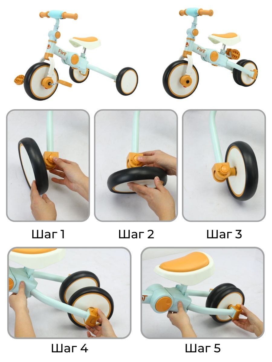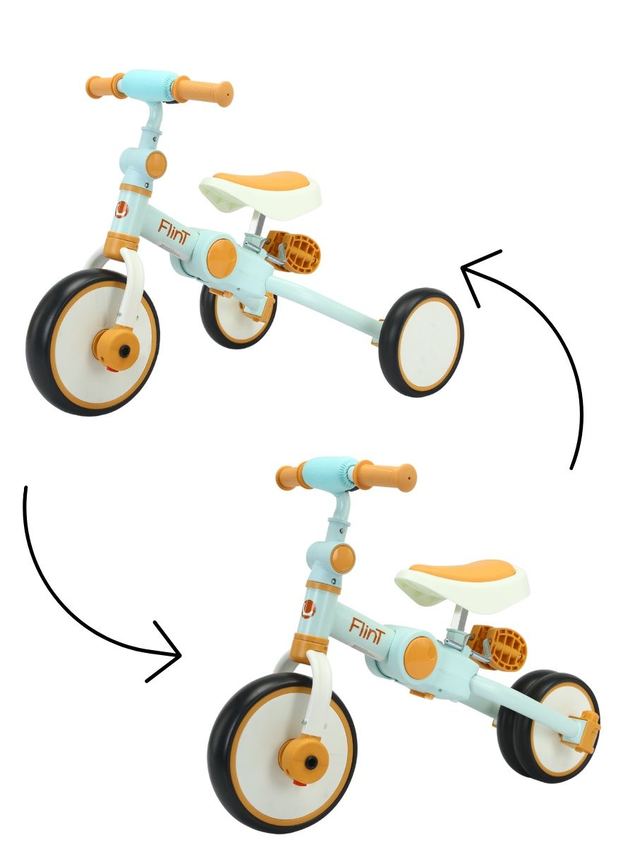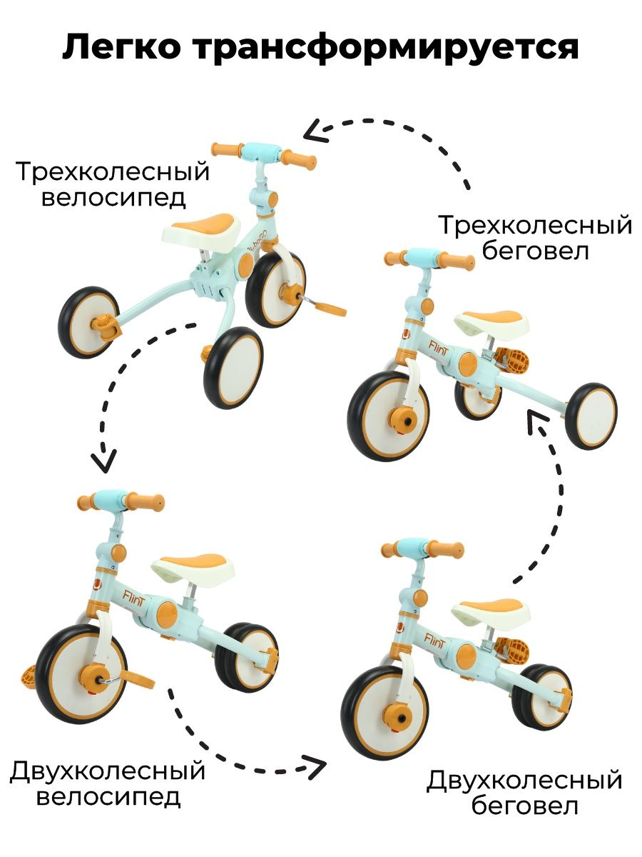 • Трансформер 4 в 1: двухколесный, трехколесный беговел и двухколесный или трёхколесный велосипед;