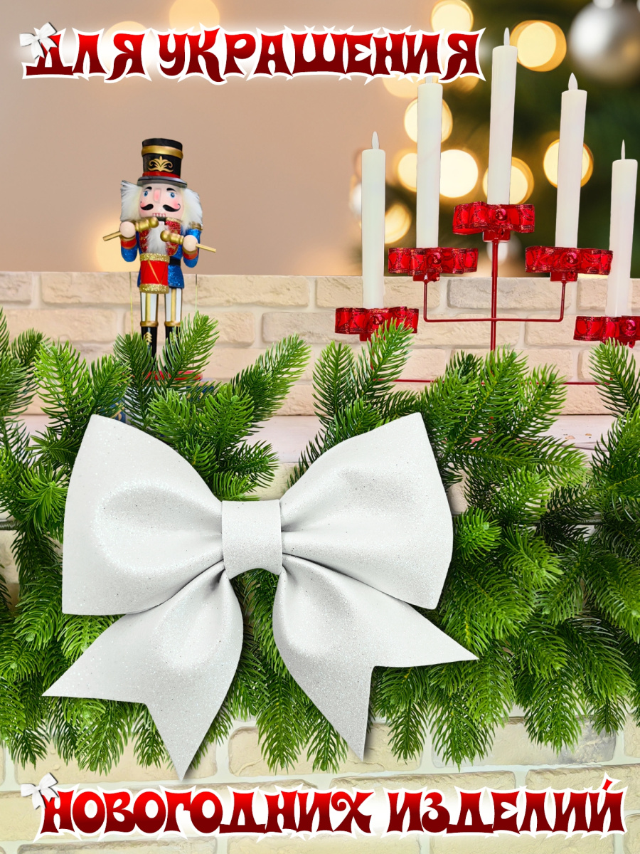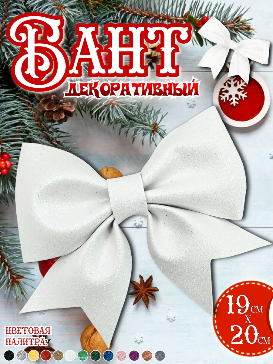 Декоративный бант "Елочные сказки" из фоамирана станет прекрасным дополнением к вашему декору, на праздник, торжество или просто для души. Этот рельефный бант с острыми очертаниями из плотного и блестящего фоамирана придаст праздничное настроение любому интерьеру. Его нежно-белый цвет, покрытый переливающимся глитером хамелеон и праздничный дизайн в виде банта, идеально впишутся в общую тематику праздника. Бант можно использовать как украшение для елки, интерьера и просто для создания акцентных элементов, создавая атмосферу уюта и волшебства. Также, подойдет для украшения подарочных коробок. Фоамиран — это мягкий, легкий, пластичный полимерный материал, его ключевыми характеристиками являются гибкость, плотность и разнообразие цветов. Данный материал не теряет цвет и не деформируется со временем, поэтому ваш бант долго будет радовать вас своей красотой. Бант имеет выпуски из декоративной проволоки для удобного крепления +- 10 см.