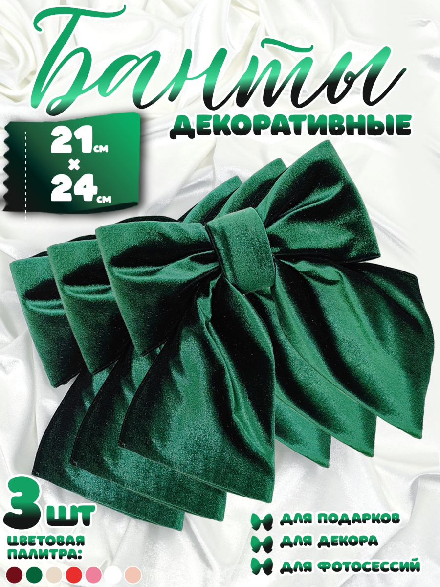 Набор декоративных бантов "Елочные сказки"- 3 шт, станет прекрасным дополнением к вашему декору, на праздник, торжество или просто для души. Эти изящные банты из мягкого велюра, с подложкой из вспененного полиэтилена, придадут праздничное настроение любому интерьеру. Их богатый темно-зеленый цвет и дизайн в виде банта, идеально впишутся в общую тематику праздника. Банты можно использовать как украшение для елки, для волос, для создания акцентных элементов одежды, а также для декора дома, мебели, создавая атмосферу уюта и волшебства. Также, подойдут для украшения подарочных коробок. Для использования в интерьере, для одежды и волос, требуется дополнительное крепление (в комплект не входит).