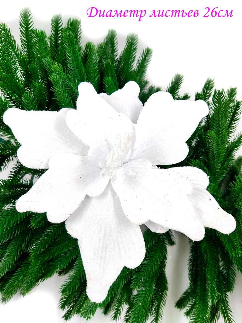 Новогодний декор в виде бантика, ленты, бус, цветов и веток украсит интерьер дома или офиса в преддверии Нового года. Оригинальный дизайн и красочное исполнение создадут праздничное настроение. Новогодние украшения всегда несут в себе волшебство и красоту праздника. Создайте в своем доме атмосферу тепла, веселья и радости, украшая его всей семьей.Диаметр листьев в развернутом виде до 26 см.
