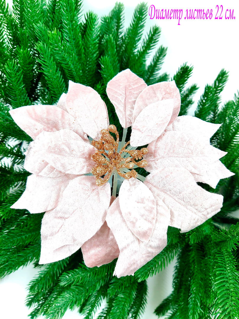 Новогодний декор в виде бантика, ленты, бус, цветов и веток украсит интерьер дома или офиса в преддверии Нового года. Оригинальный дизайн и красочное исполнение создадут праздничное настроение. Новогодние украшения всегда несут в себе волшебство и красоту праздника. Создайте в своем доме атмосферу тепла, веселья и радости, украшая его всей семьей.Диаметр листьев в развернутом виде до 22 см.