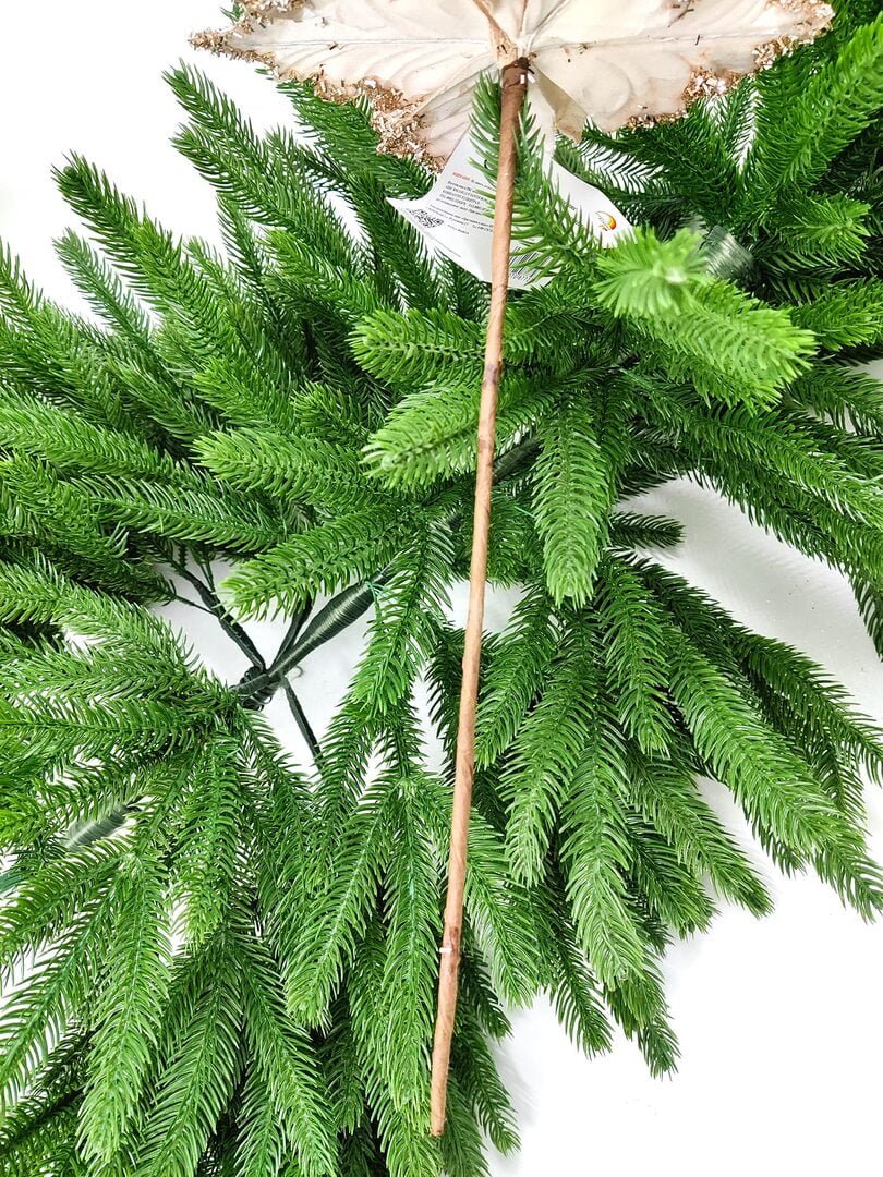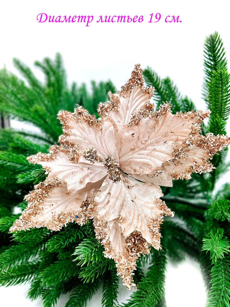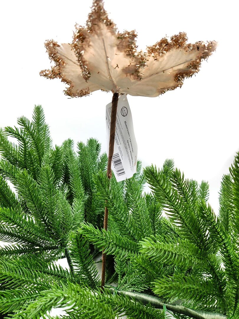 Новогодний декор в виде бантика, ленты, бус, цветов и веток украсит интерьер дома или офиса в преддверии Нового года. Оригинальный дизайн и красочное исполнение создадут праздничное настроение. Новогодние украшения всегда несут в себе волшебство и красоту праздника. Создайте в своем доме атмосферу тепла, веселья и радости, украшая его всей семьей.Диаметр листьев в развернутом виде до 19 см.