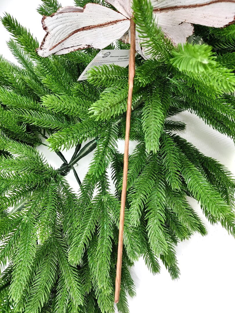 Новогодний декор в виде бантика, ленты, бус, цветов и веток украсит интерьер дома или офиса в преддверии Нового года. Оригинальный дизайн и красочное исполнение создадут праздничное настроение. Новогодние украшения всегда несут в себе волшебство и красоту праздника. Создайте в своем доме атмосферу тепла, веселья и радости, украшая его всей семьей.Диаметр листьев в развернутом виде до 26 см.