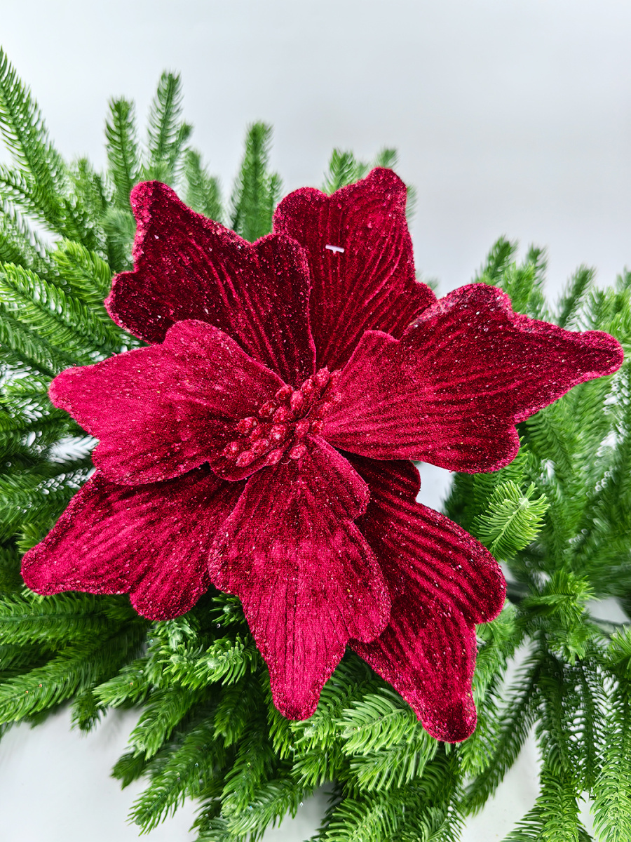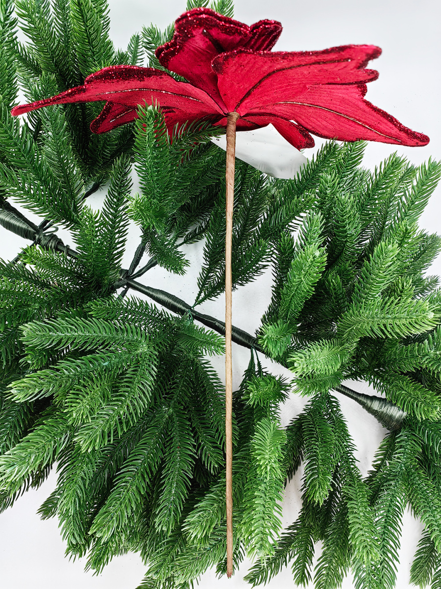 Новогодний декор в виде бантика, ленты, бус, цветов и веток украсит интерьер дома или офиса в преддверии Нового года. Оригинальный дизайн и красочное исполнение создадут праздничное настроение. Новогодние украшения всегда несут в себе волшебство и красоту праздника. Создайте в своем доме атмосферу тепла, веселья и радости, украшая его всей семьей.Диаметр листьев в развернутом виде до 26 см.