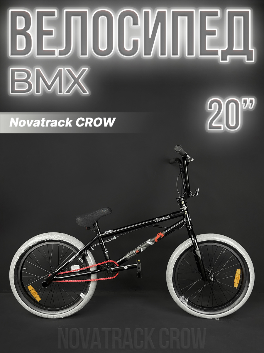 Велосипед BMX Novatrack Crow. Укомплектован навесным оборудованием начального уровня: U-brake тормозом, двойными алюминиевыми ободами, стальными втулками и кареткой, покрышками Wanda Compass 20"×2.35. Этот велосипед достойный вариант для освоения дисциплины BMX и простейших трюков. Дизайн байка соответствует дизайну серии трюковых самокатов Novatrack Crow, созданные специально в едином стиле.