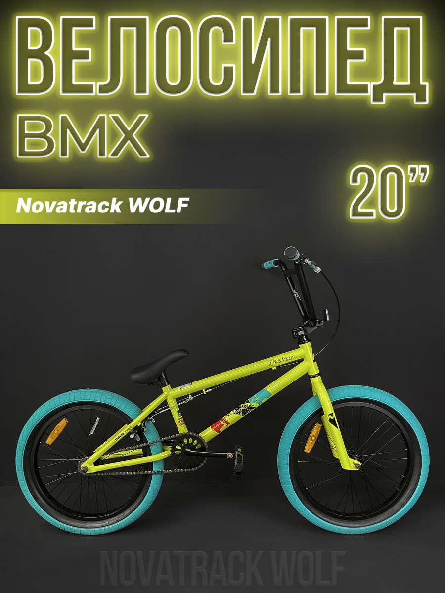 Novatrack Wolf – BMX для новичков данной дисциплины. Оснащен стальной рамой, двойными алюминиевыми ободами, стальными компонентами, U-brake тормозами, покрышками Wanda Compass, 20"×2.25. Велосипед не требует сложного обслуживания. Подходит для ежедневной уличной езды и изучения простых трюков. Дизайн рамы соответствует дизайну серии трюковых самокатов Новатрек Wolf.
