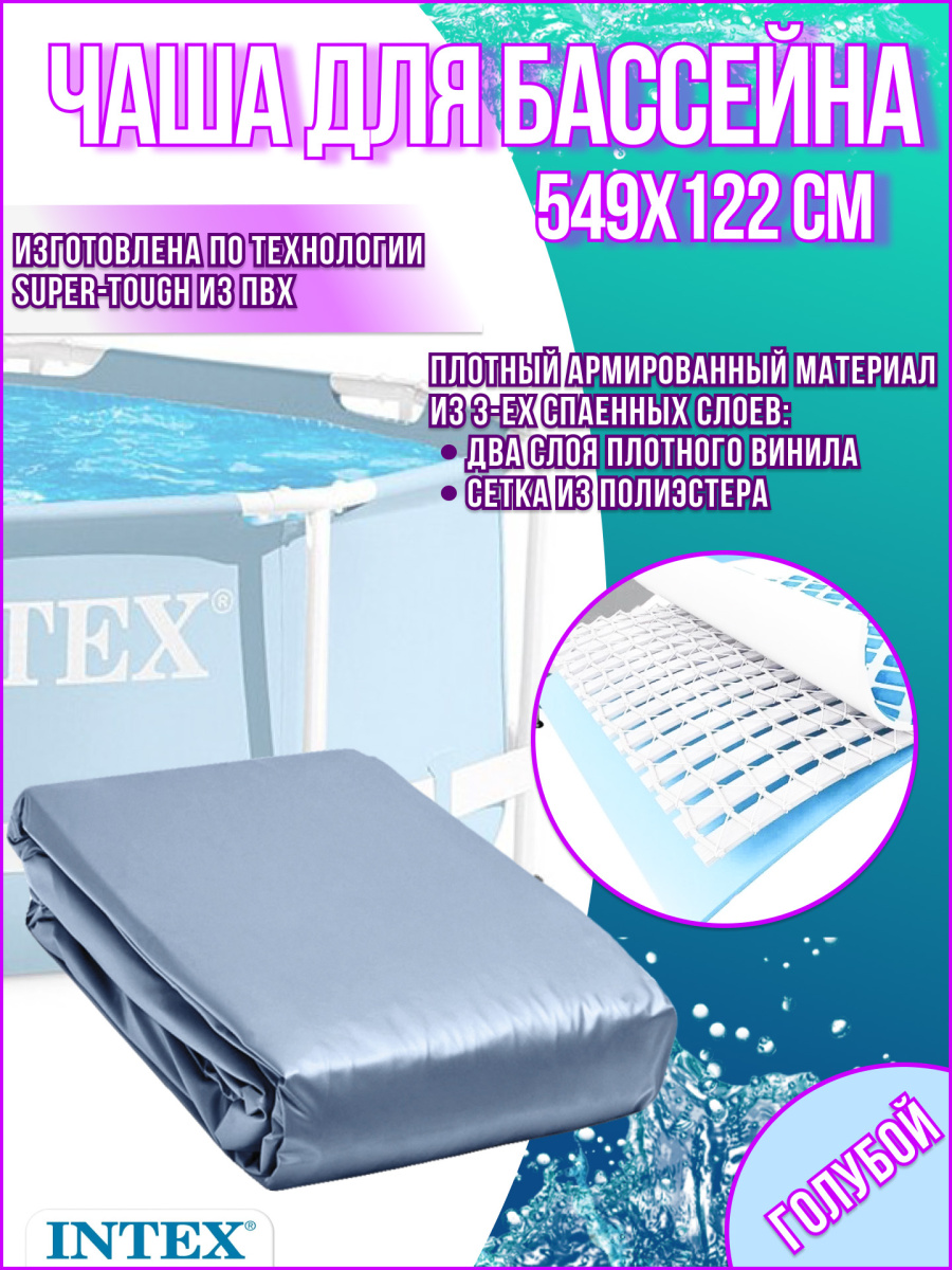 Оригинальная чаша Intex 10099 для круглых каркасных бассейнов серии Intex METAL FRAME размером 549 х 122 см. Изготовлена по технологии SUPER-TOUGH из ПВХ. Это плотный армированный материал из трех спаенных слоев: два слоя плотного винила и сетка из полиэстера. Такое сочетание наделяет материал огромным запасом прочности. В чаше имеются отверстия для подключения фильтрационного оборудования и сливной клапан снизу. Если по какой-либо причине чашковый пакет вашего бассейна вышел из строя и не подлежит ремонту - эта чаша позволит сэкономить на покупке нового каркасного бассейна Intex и за небольшие деньги восстановить бассейн. Совместима с бассейнами Intex размером 549*122см.
