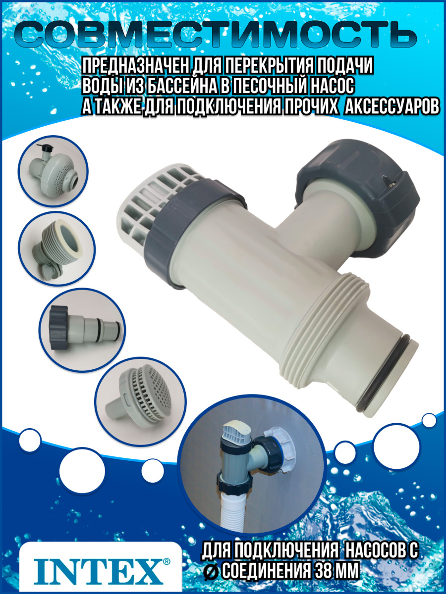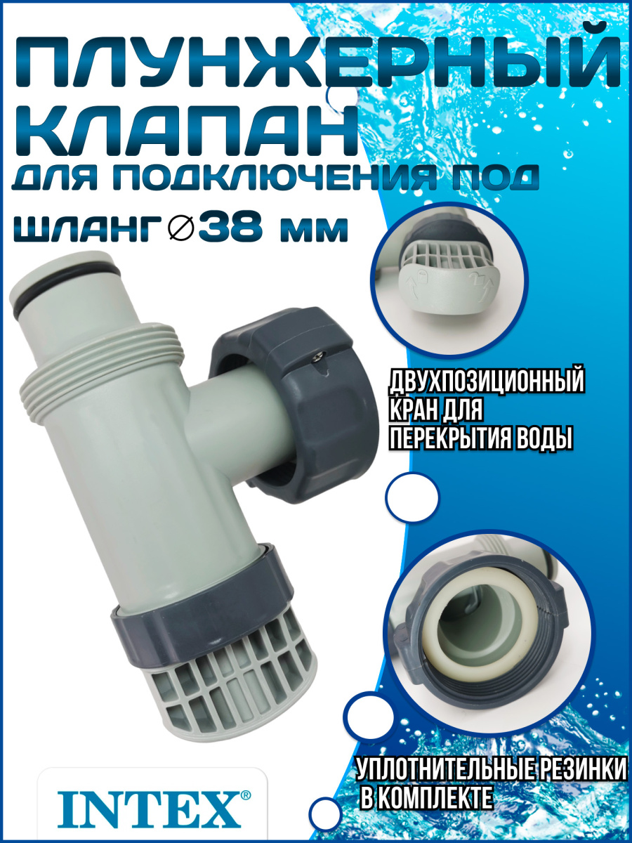 Плунжерный клапан 38 мм Intex 10747 предназначен для облегчения обслуживания песочного или картриджного фильтра. С помощью клапана Вы можете перекрыть воду в бассейне и приступить к обслуживанию фильтра (почистить, поменять картридж). Плунжерный клапан подходит для насосов с диаметром соединения патрубка 38 мм.