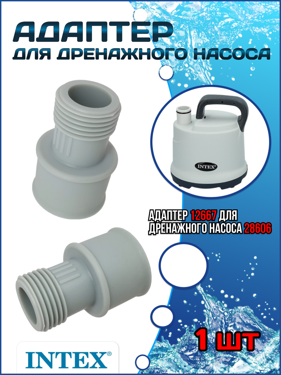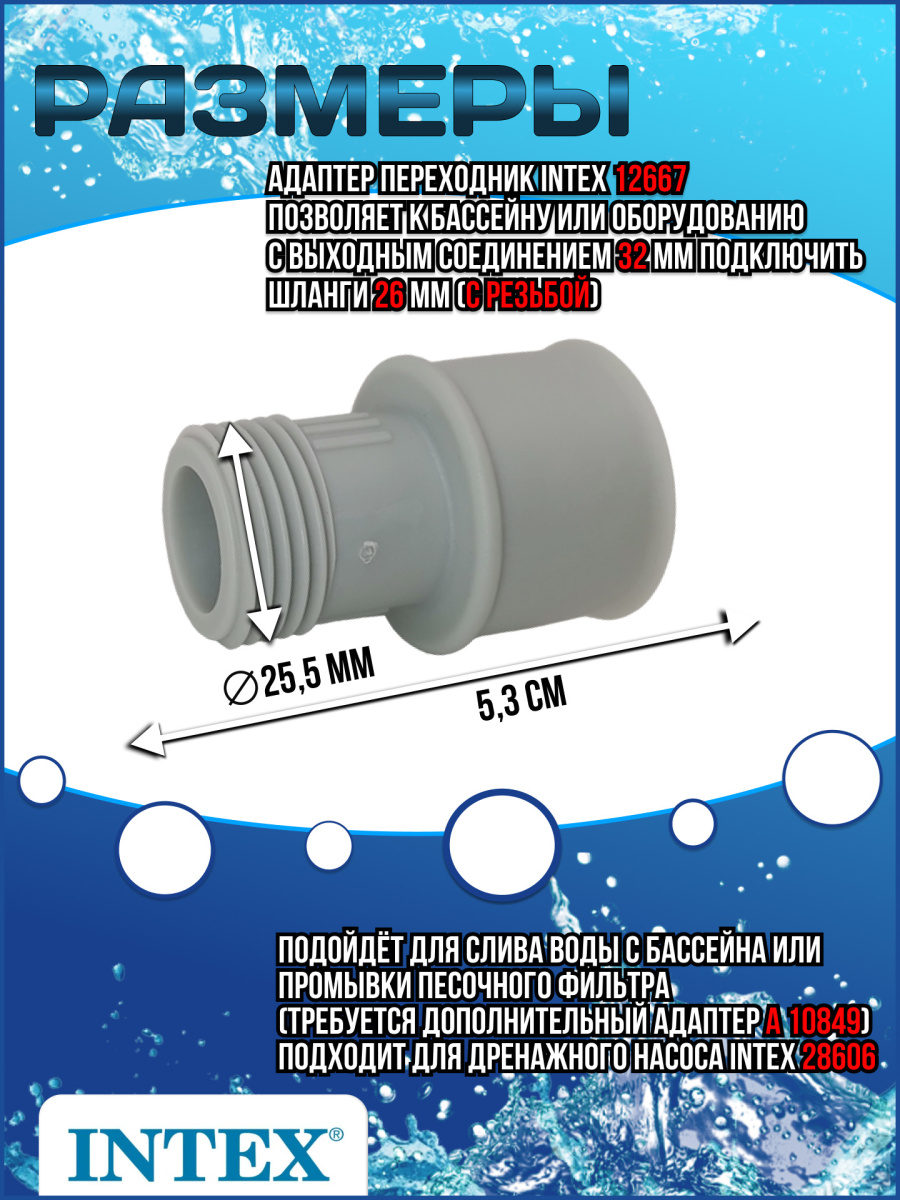 Адаптер переходник Intex 12667 позволяет к бассейну или оборудованию с выходным соединением 32 мм подключить шланги 26 мм (с резьбой). Подойдёт для слива воды с бассейна или промывки песочного фильтра (требуется дополнительный адаптер А 10849). Подходит для дренажного насоса Intex 28606.