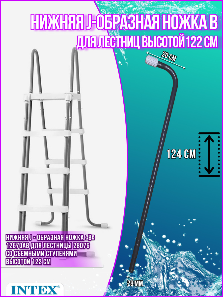 J-образная нижняя ножка В Intex 12670AВ подходит для лестниц Intex 122 см со съемными ступенями 28076. Диаметр - 28 мм, длина ножки 20 см, общая длина 124 см.